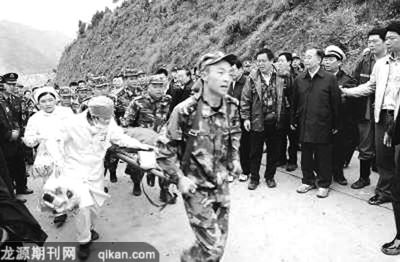 “让开、让开”,此时,几位解放军战士抬着一个小女孩从县城方向跑过来,大家赶紧让路。温家宝见状对大家说,一开始定的救人第一的原则是对的,现在时间还来得及,大家要赶紧救人。