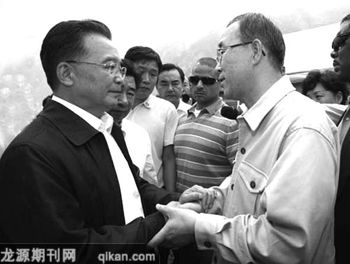 温家宝对潘基文说,我们是在汶川大地震的震中地区相遇,这是一次不同寻常的会面。秘书长先生专程前来走访中国地震灾区,我代表中国政府和人民向你表示感谢。