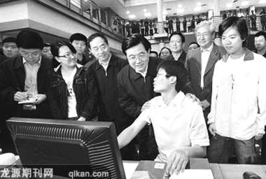 胡锦涛来到图书馆,走到学生们中间,大家非常欣喜,纷纷向总书记问好。胡锦涛微笑着与学生们握手,并同大家交谈起来,询问他们在念几年级、学什么专业。看到学生们专心致志学习的情景,总书记十分欣慰。