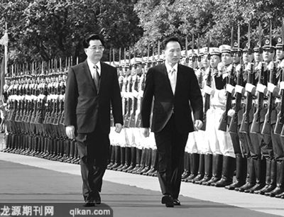 会谈前,胡锦涛主席在人民大会堂东门外广场为李明博总统访华举行欢迎仪式。胡锦涛主席夫人刘永清、全国人大常委会副委员长陈昌智、国务委员戴秉国、全国政协副主席黄孟复、民进中央副主席王佐书、外交部部长杨洁篪、教育部部长周济、科技部部长万钢、商务部部长陈德铭、中国驻韩国大使宁赋魁等出席欢迎仪式。