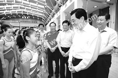7月23日,中共中央总书记、国家主席、中央军委主席胡锦涛和中共中央政治局常委、中央书记处书记、国家副主席习近平来到这里,考察奥运备战工作,看望运动员、教练员和工作人员,代表党中央向大家表示诚挚的问候。