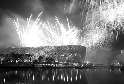 同一时刻,北京市的18个区县燃放起绚丽的焰火。天安门广场上空,一朵朵绽放的礼花汇聚成耀眼璀璨的巨圆,象征着北京奥运会圆满成功。