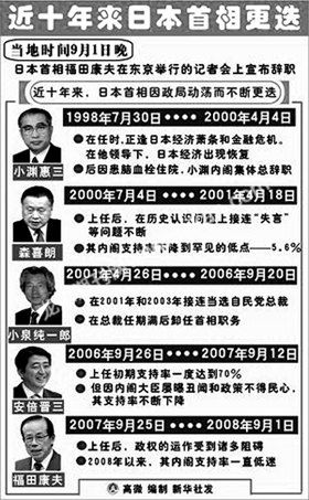 人民日报编辑李文云、曹鹏程:有人说,自民党患上了“慢性人气缺乏症”,主动请辞的两位日本首相都面临着这样的问题。当小泉时代改革的负面遗产开始显现的时候,怎样评价之前的改革?当旧的经济结构被改变的时候,新的结构如何建立?自民党没有及时地解答这些问题,而控制了参议院的最大在野党——民主党也没有答案,他们只是一味地在参议院逢法必反,给自民党制造麻烦,导致政府不能令行禁止、国会效率超低的尴尬现状,是否可以认为这令福田内阁难以为继?