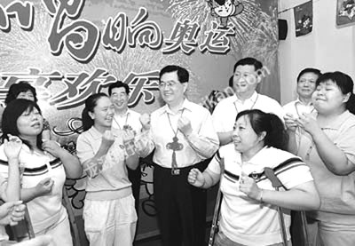 游泳是我国在残奥会上的优势项目,这次我国派出了41名运动员参加北京残奥会游泳比赛。胡锦涛来到游泳馆看望运动员。
