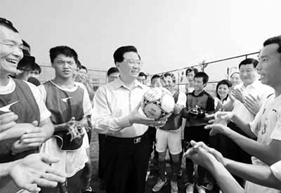 “好!”胡锦涛说着,拿起笔在一个足球上一笔一画地写下“自强不息、奋勇争先”8个字。