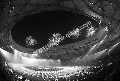 灯光转暗,音乐响起。一只象征着光明与温暖的太阳鸟从“鸟巢”上空翩翩飞来,大型文艺表演拉开帷幕。