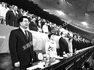 19时54分,在欢快的迎宾曲中,胡锦涛、江泽民和克雷文等来到主席台,向全场观众挥手致意。国家体育场内响起热烈的掌声。