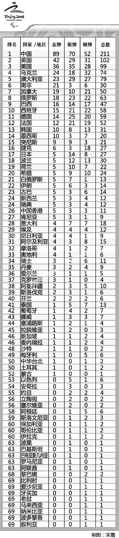残奥会奖牌榜