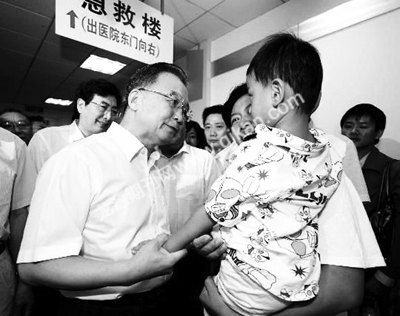 9月21日上午,中共中央政治局常委、国务院总理温家宝来到北京市医院、社区和商场,看望在“三鹿奶粉”事件中患病的儿童,了解救治情况和奶制品市场。中共中央政治局委员、北京市委书记刘淇,北京市市长郭金龙陪同考察。