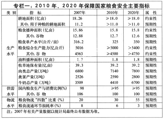 ——保障粮食等重要食物基本自给。粮食自给率稳定在95%以上,到2010年粮食综合生产能力稳定在5000亿公斤以上,到2020年达到5400亿公斤以上。其中,稻谷、小麦保持自给,玉米保持基本自给。畜禽产品、水产品等重要品种基本自给。