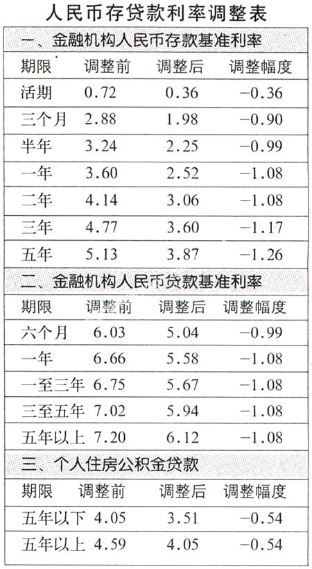 央行宣布,从2008年11月27日起,下调金融机构一年期人民币存贷款基准利率各1.08个百分点,其他期限档次存贷款基准利率作相应调整。同时,下调中央银行再贷款、再贴现等利率。
