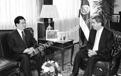 11月17日,胡锦涛在圣何塞同哥斯达黎加总统阿里亚斯举行会谈。