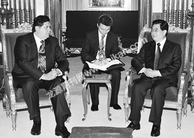 当天,胡锦涛在利马会见哥伦比亚总统乌里韦。
