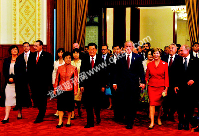 2008年8月8日中午,北京人民大会堂北大厅,欢迎午宴之前,胡锦涛和夫人与包括美国总统布什夫妇、俄罗斯总理普京、日本首相福田康夫夫妇在内的各国政要,一一握手并合影留念。当天晚上正式开幕的第29届北京奥运会,俨然成就了一次“政要们的奥林匹克”。