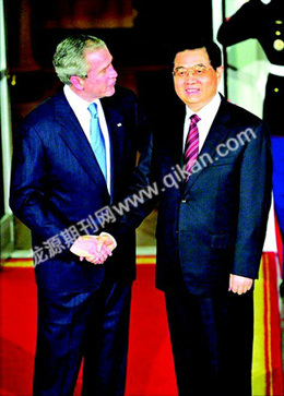 此前一天晚上,在布什的迎客晚宴上,胡锦涛也被安排坐在布什身边。当布什上台讲话时,电视镜头里不时出现中国国家主席谦和的微笑。而面对一拥而上的记者,布什表现得与胡锦涛格外亲昵,在大多数情况下,他的身体总是斜侧45度,朝着胡锦涛端坐的方向。