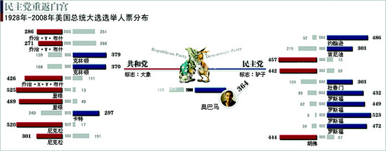 的确,在白人选民中奥巴马的得票率不敌麦凯恩的55%,但民主党候选人在白人选民中的支持率从来不敌共和党,而奥巴马的43%已经创下1964年以来民主党总统候选人获得白人支持的最高比例。在其他族裔中,奥巴马在拉丁裔选民中获三分之二的支持,在黑人选民中可想而知获得96%的支持。最终,他获得投票总数52.5%和364张选举人票,大胜对手。