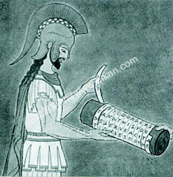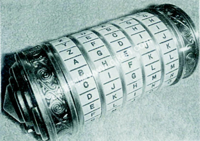 密码器作为承载密码学的工具,最早仍可追溯至古希腊。据记载,当时的加密器械是将一张皮革螺旋缠绕在木棍上,沿木棍纵轴方向在带子上写好明文,解下来的皮革上就只呈现杂乱无章的密文字母。解密者需找到相同直径的木棍(在战时,通常由一根木棍截成两段而来),再把皮革缠绕上去,沿木棍纵轴方向即可读出有意义的明文。这也是原始的换位密码术。