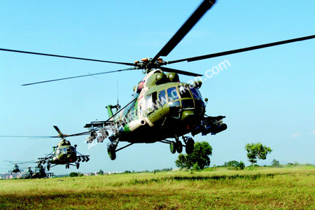 2005年,中俄联合军事演习。战斗开始后,直升机编队腾空而起,在超低空域悄悄向目标接近。抵达作战地域上空后,随着“发射”指令的下达,一枚枚航空火箭弹呼啸着扑向“敌”阵,把山头变成一片火海,联军形成空中、海上、地面立体突防、同步展开的态势。