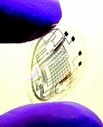 华盛顿大学研制的这种眼镜相当于一个显示器,佩戴者通过它看到的图像、地图和数据等,就好像飘在半空。该眼镜利用发光二极管和一个射频接收器产生作用,太阳能电池为发光二极管提供能量。