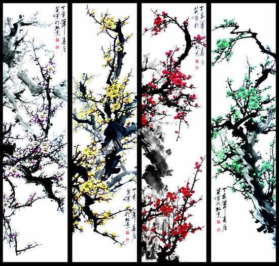 在一间红木家具布置的客厅里,站在李英保先生创作的梅花四条屏前,感到有一股沁人肺腑的幽香,随着清雅悠扬的古乐,品茗静思,中国文人画的历史长卷缓缓打开。