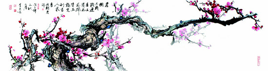 从李英保先生近几年的作品中,可以体味到他在梅花的海洋中博采众览,寻求自己的高点。他在关于梅花的著作中非常清楚的谈了继承与发展的关系。他关注扬无咎、王冕、金农。宋代画梅高手扬无咎继承前人,创“疏枝冷蕊,清瘦绝人”的清新格调。元代画家王冕的墨梅在扬无咎技法的基础上,又有了新的突破。清代朱方蔼说:“宋人画梅,大都疏枝浅蕊,至元煮石山农始写以繁花,千丝万簇,倍觉风神绰约,珠胎隐现,为此花别开生面。”画梅“以胭脂作没骨法”是王冕首创,他的画梅法对后代影响深远,著《梅谱》传世。在技法上,画家以淡墨写枝干,用浓淡相兼的墨笔勾花点蕊萼,显得极为清润,在表现了梅花天然神态的同时,也寄托了画家的主观意兴。金农是“扬州八怪”中重要的画家之一,流传域外的《梅花图》,是以墨笔描绘的梅花通景四条屏,款署:“乾隆元年十月在宣武门外寓楼中画,钱塘金农”。以该图所绘梅花之老干虬枝,繁花密蕊,非卓富功力者不能办到。金农其后的传世画梅作品,无论亲笔、代笔,均属逸笔画法。从李英保的作品中,可以感觉到他画梅的水墨技巧,吸收了历史上画梅大家的营养;构图上,多研究近现代画梅高手的大作,汲取吴昌硕的繁枝花茂,参阅于希宁的“多是梦梅三两枝”。因此,无论是丈二匹的大规格,还是扇面、弧圆小品,都让人读出李英保梅花的特有韵味。