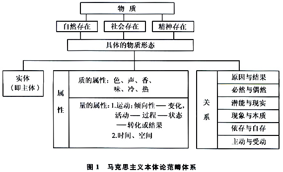 这也就是说,在马克思主义的本体论范畴体系中,物质是最高的范畴,反映的是一切存在、一切能用“是”加以述谓的对象的普遍本质。在它之下,第二级的范畴主要有:自然存在、社会存在、精神存在。它们表示的是统一的物质的三种存在方式。第三级的范畴是具体物质形态或个体事物。它是前面两级范畴的具体化,因为存在总是以个体事物的形式存在的。而个体事物本身又是体与用、实体与属性、主体与运动的统一体。具体言之,它又以实体、主体、属性和关系为自己的存在方式,或以这些形式显现出来。这里所说的实体实际上就是主体,因为个体事物既是属性、关系的载体,又是运动的主体。从存在的程度上说,实体、主体有独立的存在性,甚至可以说是绝对的、真实的、基本的存在。而时、空、运动、关系等范畴所表述的对象不可能有独立存在性,但有相对的、依附性的存在性,因为它们表示的是某种个体事物的不同的实现 方式,亦即不同的存在方式。