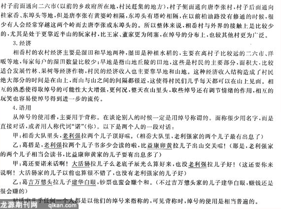 [摘要]宁波田螺山地区相岙村的绰号使用十分广泛,全村每个成年男子都拥有一个固定的绰号,多以“名字+绰号”四字格格式出现,也有少量三字格和二字格。语义以“描摹性情”、“勾画相貌”、“生殖器名”、“表述特长”或“轶事典故”为主,起用缘由受性别、地理、经济和语用限制,直接体现着该村的生产方式和从业特点,其社会文化的时代痕迹明显。