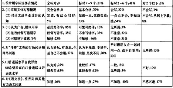 从上述调查情况和数据分析中我们看到了大学生语文能力现状中的可喜现象和不足之处。例如大学生对规范字、时尚词和普通话的认识是正确的,他们对提高自己的语文能力和提高自己普通话口语表达水平是充满期待的。调查中显示的大学生的认读能力和一般书面语能力不足,这应该是几十年应试教育的后遗症。调查的第6个问题中,显示出大学生对语言文字问题关注不够,表现在他们对《语文法》和“全国推广普通话宣传周”等与我们当前语文生活密切相关的问题并没有投入过多关注,这与该人群目前所处环境和地位很不相称。