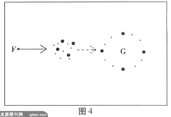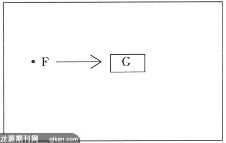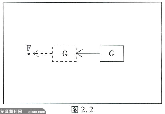 另一种虽不常见但的确存在的情况是施力者(F)发出的不是离心力(向外的推力),而是向心力(朝向自身的拉力或吸引力),受力者(G)受迫力拉动或吸引移向靠近施力者(F)的位置,可用图2.2表示:
