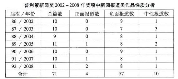 事实上,对负面消息的极大关注绝不是近年来普利策奖的偶然钟爱。正如美国普利策新闻奖委员会现任执行官西格·基塞勒所言:“战争、灾难、挖掘社会问题、揭露贪污、揭露政府等的问题一直是评委喜欢的题材。”根据道格拉斯·贝茨在《美国普利策奖内幕》一书的估计,从1917年到1990年颁发的普利策奖中,约有40%属于揭露性报道,另有40%是对战争、犯罪、公民自由、种族关系、自然灾害和国际方面的报道。这一估计反映了美国的主流媒体一直是以揭露性和灾难性事件为报道主体的,反映了一种西方新闻报道的基本理念。就拿2008年4月7日揭晓的第92届普利策新闻奖来说吧,从11项获新闻报道奖的作品看,有8项明显是以负面揭丑为题材取向的报道,真可谓负面题材势头依然不减,“负面报道为主”的主旋律高奏不衰:《华盛顿邮报》所获6项大奖中就有伊拉克与阿富汗战争中美国陆军“王牌医院”虐待退伍伤员、副总统切尼私用权力、伊拉克私人保安公司鱼目混杂、弗吉尼亚理工学院校园枪击案等一系列揭丑性报道,《纽约时报》则是以一篇有关中国出口医药中有假药和有毒性原料的报道获调查性报道奖,另外一名调查性报道奖的获得者是《芝加哥论坛报》的员工,文章曝光了政府有关玩具、汽车座和婴儿床的规定的过失,路透社的阿德里斯·拉蒂夫获现场新闻摄影奖,他的获奖作品是在缅甸拍到的一名垂死的街道示威者的照片。