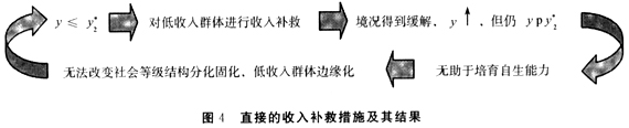 针对这种“内生因素决定的收入差距”,当前理论界和政府部门往往只关注收入分配本身,政策措施也集中在采取“收入补救→收入均等化”的直接方法(诸如扶贫、增加农民等中低收入者收入、扩大中等收入阶层等)来提高低收入群体的绝对收入。这尽管在一定程度上缓解了低收入群体的困窘状态,但却不能从根本上满足低收入群体的发展需求,从而也无助于培育低收入群体的“自生能力”,也就不可能通过起点的公平和机会的公平来打破收入结构的恶性累积循环(见图4)。