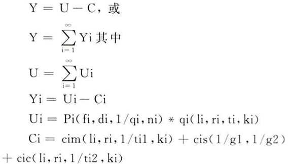 在这里,Y为净收益,U为总收益或总效用,C为总成本;i表示第i个产品,Yi为产品净收益函数,Ui为第i个产品效用函数,Ci为第i个产品成本函数;Pi是第i个产品的市场价格,fi为第i个产品的消费者偏好,di第i个产品为劳动分工与市场交换的深度与广度或商业的繁荣程度,qi为第i个产品数量,ni为第i个产品市场上的消费者人数,li为第i个产品消耗的劳动,ri为第i个产品消耗的资源,ti为第i个产品所使用的技术,ki为第i个产品所用的资本,它的本质是普及了的技术,作为技术它仍可带来人均财富的增加,但作为企业经营手段它在市场上的赢利价值越来越小,因而只能带来收益递减的利息;Cim为生产成本,ti1为第i个产品使用的生产技术,作为新发明的产物它可以为企业带来巨大的超额利润,一旦普及就只能成为资本了,Cis为社会交易成本即公共产品成本,其主要成分是文化与制度建设成本(g1为意识形态,g2为法律制度),Cic为企业交易成本,其主要成分是货币体系与运输成本及企业支付的微观法制成本,ti2为第i个产品使用的交易技术。在这里产品价格函数是消费偏好、市场交易程度与消费者人数的增函数,是产品数量的减函数;产品数量函数则是劳动、技术、资源与资本的增函数;而生产成本函数Cim则是劳动、资源与资本耗费的增函数,是技术水平的减函数。因此,在经营中生产可以增加产品数量,交易可以增加产品价格,技术可以减少单位产品成本,创新可以增加产品种类数量,并且产品种类的增加没有任何上限。其中除了劳动的增加外,任何因素的变化都能带来人均的增长。