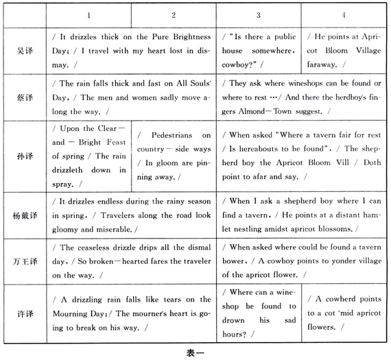 黄国文在《杜牧(清明)英译文的逻辑功能分析》一文中收集了6种关于《清明》一诗的英译文,制作出一张表格,见表一。为了叙述方便,分别以吴译(吴钧陶译)、蔡译(蔡廷干译)、孙译(孙大雨译)、杨戴译(杨宪益、戴乃迭译)、万王译(万昌盛、王僴中译)、许译(许渊冲译)代表这6种译文。为了充分体现不同民族文化符号的平行对照,我们再引入鲍里斯·梅谢里亚科夫的俄语译文: