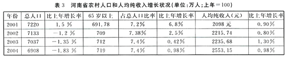 近年来,河南省人口增长率很低,特别是近三年人口出现负增长,(见表3)2002年人口增长率为-1.2%,2003年和2004年分别为-1.35%和-1.83%。人口负增长呈加快趋势。由于计划生育等原因,这种趋势会成加速之势。