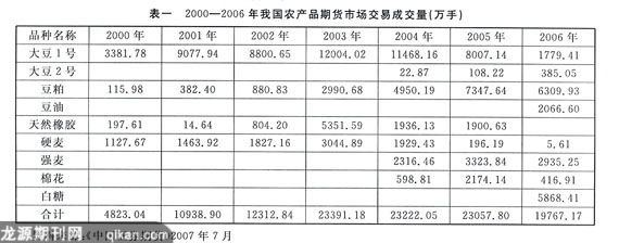 我国的期货市场始于农产品期货,至今已有近20年的时间了。在这期间,我国的期货市场可谓是走过了一条曲折的发展道路,从建立之初的盲目扩张时期,到规范治理整顿时期,再到经过规范整顿后的健康发展时期。进入新世纪后,我国期货市场特别是农产品期货市场逐渐步入健康的发展轨道,成交量和成交额在逐年增加。(见表一)