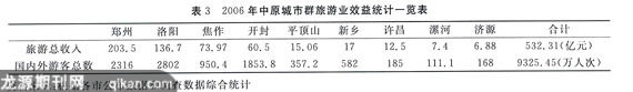 2006年中原城市群共接待国内外游客9325.45万人次,旅游总收入532.31亿元,分别占全省接待游客总数和旅游总收入的71.39%和52.34%。“十五”期间,中原城市群旅游接待量和旅游收入分别占到全省的77.4%和56.8%。中原城市群的郑州、洛阳、焦作、开封等4个城市在河南省18个地级市旅游业排名中占据前四位。同时,中原城市群的旅游产业也已初具规模,目前已经形成了“食、住、行、游、购、娱”协调配套、功能齐全、有较高档次和较大规模的比较完善的旅游产业集群体系。