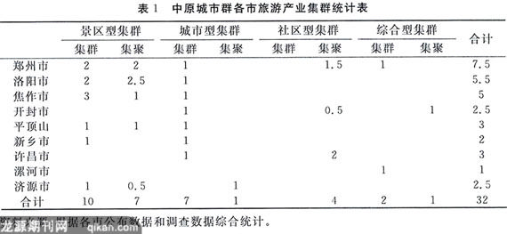 笔者依据上述旅游产业集群的基本概念和构成原理,对中原城市群的旅游产业进行了系统的调查分析,从而获得了一批十分有价值的数据。据统计,中原城市群内共有19个已初步形成的旅游产业集群。其中,年收入超亿元的大型旅游产业集群有12个,如郑州都市旅游产业集群、登封嵩山旅游产业集群(郑州)、洛阳古都旅游产业集群、栾川山水旅游产业集群(洛阳)、开封古都旅游产业集群、修武云台山旅游产业集群(焦作)等。正在快速向亿元产业集群发展的有7个,如惠济黄河休闲旅游产业集群(郑州)、新郑文化旅游产业集群(郑州)、许昌市古都旅游产业集群等。此外,还有13个正在形成的旅游企业集聚区(集群雏形),如小浪底水库旅游产业集群(洛、济)、巩义名胜旅游产业集群(郑州)、朱仙镇文化旅游产业集群(开封)、鄢陵花都旅游产业集群(许昌)、中牟乡村旅游产业集群(郑州)等。(见表1)
