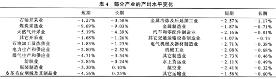第三类是出口型行业。在短期内,由于产品国际竞争力下降,出口型企业的产出有较大下降:纺织业、服装制造业和皮革毛皮羽绒及其制品业分别下降了2.85%、3.3%和4.56%,电气机械及器材制造业、机械工业和其它制造业都有一定程度的下降;在长期由于贸易竞争力的改善,这些产业的产出有很大程度的恢复。而电气机械及器材制造业、机械工业和其它制造业产出下降的另外一个原因是它们均属于高能耗部门,能源投入成本的上升必然使产出下降。