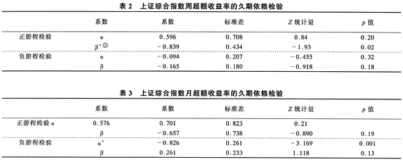 采用久期依赖检验方法,我们对上证综合指数的周收益率与月收益率进行了久期依赖检验,得到的结果见表2、3。从表2可看出,上证综合指数正周超额收益率的久期依赖检验中,β=-0.839,且P=0.02,故拒绝了H