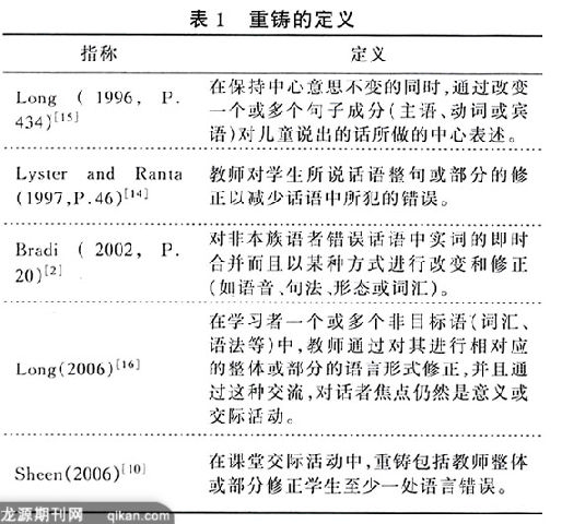 面对众说纷纭的状态,研究者们很难给出一个确切的定义,关键是人们很难比较二语研究中对重铸研究所获得的不同结果。总的来说,结合前人的研究,下表中关于重铸的定义较为普遍接受和运用。