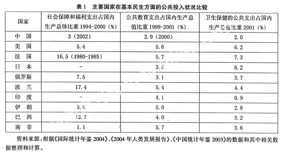 现代社会,政府是通过公共投入等途径来履行职责的。公共投入的目的是满足基本民生的需要。就公共投入的顺序而言,应当以民众的基础需求为着眼点,优先民生需要。而且,公共投入应当是为社会成员提供“一般性”的公共消费物品,而不应当是“奢华”品。反观中国现实社会公共投入的优先顺序,呈现出一种颠倒的状况。国家在社会保障、义务教育、公共卫生等直接关乎民生大事上投入的比例小得可怜。从世界主要国家的比较来看,中国在这方面的投入比例最低(见表1)。