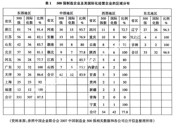 通过以上分析,我们可以发现,一定程度上代表中国制造企业整体实力的500强企业,其国际化发展速度近年来明显加快,并主要集中在我国东部沿海发达地区。虽然与发达国家跨国公司相比,我们在资本、技术、管理、国际化经验等各方面都不具优势,但劳动力密集型行业的企业融入和渗透国际市场的优势明显,而且,面对全球经济的快速发展和我国经济的可持续增长形势,我国企业已从战略上部署了国际、国内资源,在一些资源型产业有了一定的竞争优势,其国际直接投资速度加快。此外,我国国际化经营企业的规模特征差距显著,但在国际化经营战略选择上,尽管超大型企业国际化比例相对较高,可从整体分析,其规模特征差距并不显著,这一特征与传统的国际化经营理论相悖,因此,值得未来国际化经营理论研究的关注。