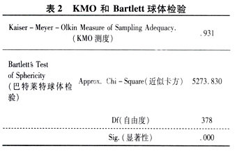 根据因子分析的前提条件,对变量进行了KMO(Kasier—Meyer—Olkin)值的计算和Bartlett球体检验。计算结果(表3)表明旅游经济影响调查数据的KMO值为0.931,Bartlett球体检验x