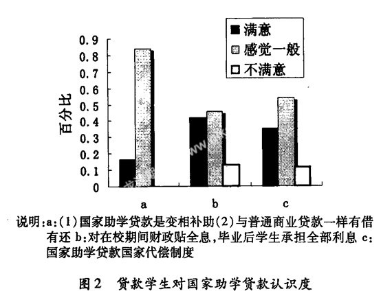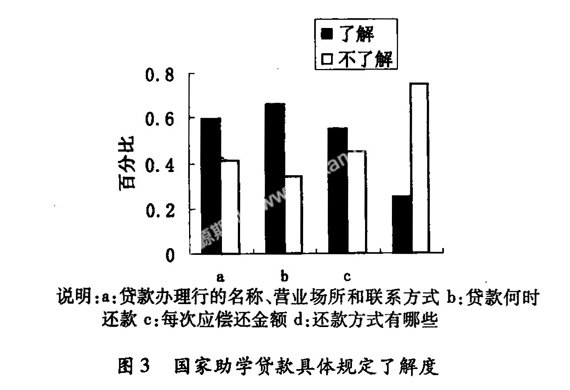 有41%贷款学生不知道自己的办理行的名称、营业场所和联系方式;34.1%的贷款学生不知何时还款;44.9%的贷款学生不知每次应还金额;75%的学生不知道有什么还款方式。上述事实表明国家助学贷款政策的宣传工作没有做到位,学生的信用意识差,不会主动去了解国家助学贷款具体政策规定。