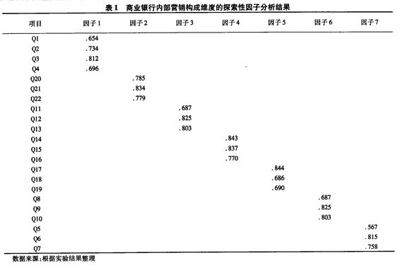在分析各个因子所包含的项目意义的基础上,参照国内外学者对内部营销构成维度的定义,并结合商业银行的实际情况,笔者对萃取出的7个因子依次命名为招聘因子、银行文化因子、激励因子、授权因子、参与管理因子、培训因子和沟通因子。