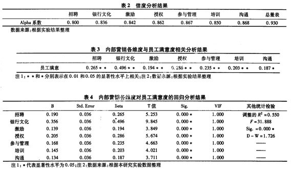 研究表明:商业银行内部营销的构成维度依次为招聘、沟通、培训、激励、授权、参与管理、银行文化;各维度对员工满意均具有直接的正向影响,但各维度对员工满意的解释和影响力存在差异,由强到弱依次为银行文化、授权、招聘、参与管理、培训、激励、沟通。