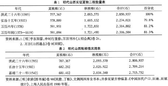 首先,众所周知,明朝建立以后,朝廷长期推行田赋定额制度,而且额度长期不变,即通常 所称的“铁板税”。如《皇明世法录》载称:“明初,定官民田赋:凡官田亩税五升三合 五勺,民田三升三合五勺。”就山西地区而言,情况也是如此。如《学海类编•晋录》载云 :“山西土田三十六万八千三十九顷二十七亩零,夏、秋二税二百七十二万四千二十二石。 ”[7]第318页注文引有明一代山西省的赋税征收数量并没有很明显的增长,甚至出 现了较明显的下降,正所谓“有减无增”。如果最初山西全省范围内田赋额度制定普遍存在 着过高的缺陷,超越了民户的支付能力,那么,田赋制度实施之始,理应引发山西全境绝大 部分农民的全面抵制与逃亡。事实上,并非如此。