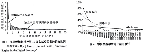 从图3的销售曲线我们可以看到亚马逊如何突破了困扰传统书店的陈列面积和最低读 者数量这两个限制。典型的巴诺超级书店通常陈列10万品种,我们就以10万为幂律曲线的头 部和尾部的分界线,销售量前10万种为头,销量排名低于10万的为尾。一项由麻省理工学院 、普度大学和卡内基•梅隆大学的学者合作的研究比较了亚马逊销售曲线的“头”和“尾” ,结果显示,亚马逊47.9%的图书销售来自销售排名第4万种以后的图书(美国最大的独立书 店的陈列品种是4万,这意味着亚马逊48% 的销售来自那些在独立书店见不到的图书);39. 2% 的销售来自销售排名第10万种以后的图书,即那些传统书店通常不进货的“长尾图书” 。换句话说,图3中那个阴影区域代表一个在传统的图书销售渠道里不存在的全新的市场。 [4]