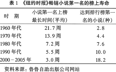 与此同时,畅销书的市场统治力正在减弱。Lulu.com是一家专营按需出版的公司,他们最 近研究了《纽约时报》畅销书排行榜50年的数据,结果发现,在过去10年里,小说类畅销书 第一名在排行榜上的寿命缩短了50%。这项研究显示,在1960年代,上榜畅销书的数量很少,但是一旦上榜,它们停留在畅销书榜 上 的时间多达几个月。在1990年代和2000年代,上榜的小说增多,但是每本小说只能在榜上停 留短短几个星期便被新的畅销书取代。鲁鲁自助出版公司(Lulu.com)的总裁鲍伯•扬(BobYoung)认为, 畅销书榜上寿命缩短反映了一个广泛的社会文化变迁,就像眼下影视和音乐行业正在经历的 变化一样。例如,在1950年代,热门电视剧《我爱露茜》(I Love Lucy)能够吸引70%的美 国家庭。如今,最热门的电视剧《犯罪现场》(CSI)只能够吸引10%的美国家庭。鲍伯•扬 认为,图书出版的未来属于那些针对特定细分市场的“小众图书”,而不属于那些希图囊括 大众市场的“畅销书”。