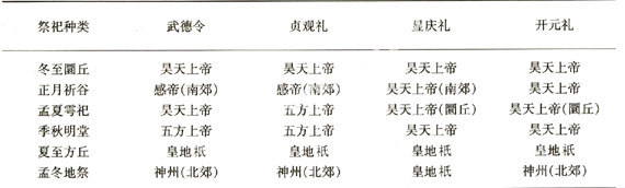 唐会要》卷9载张九龄之议论:“天者百神之君,王者所由受命也。自古继统之主,必有郊配,盖敬天命、报所受也。”郊祀礼属于“吉礼”之最重要者,在武德令、贞观礼、显庆礼及开元礼中,其仪注、时令、种类等有不同的规定,金子修一将其列表如下: